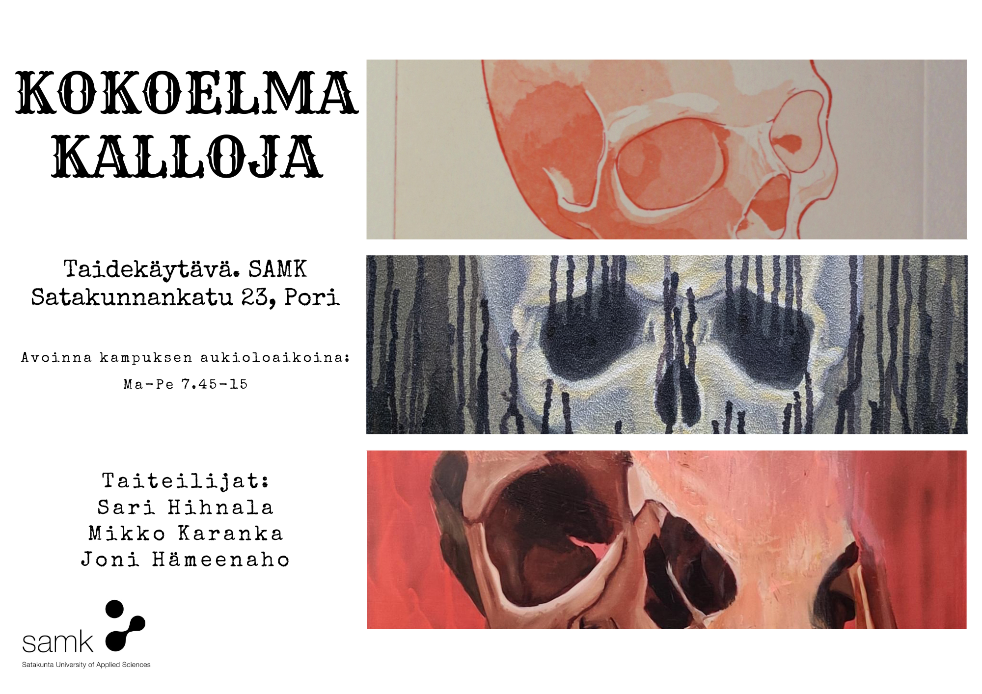 “Kokoelma kalloja” on kolmen kuvataideopiskelijan, Joni Hämeenahon, Mikko Karankan ja Sari Hihnalan yhteisnäyttely